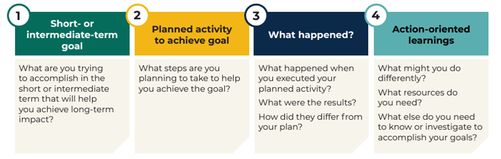 Because the L2A Log starts by tying activities to your partnership’s goals, it helps ensure your initiatives are contributing to the larger impact you’re trying to make. Using this process can also help you identify different perspectives within your multisector community partnership and achieve consensus on what to do next. Furthermore, by writing down what you learn, the L2A Log creates a record that you can refer back to.